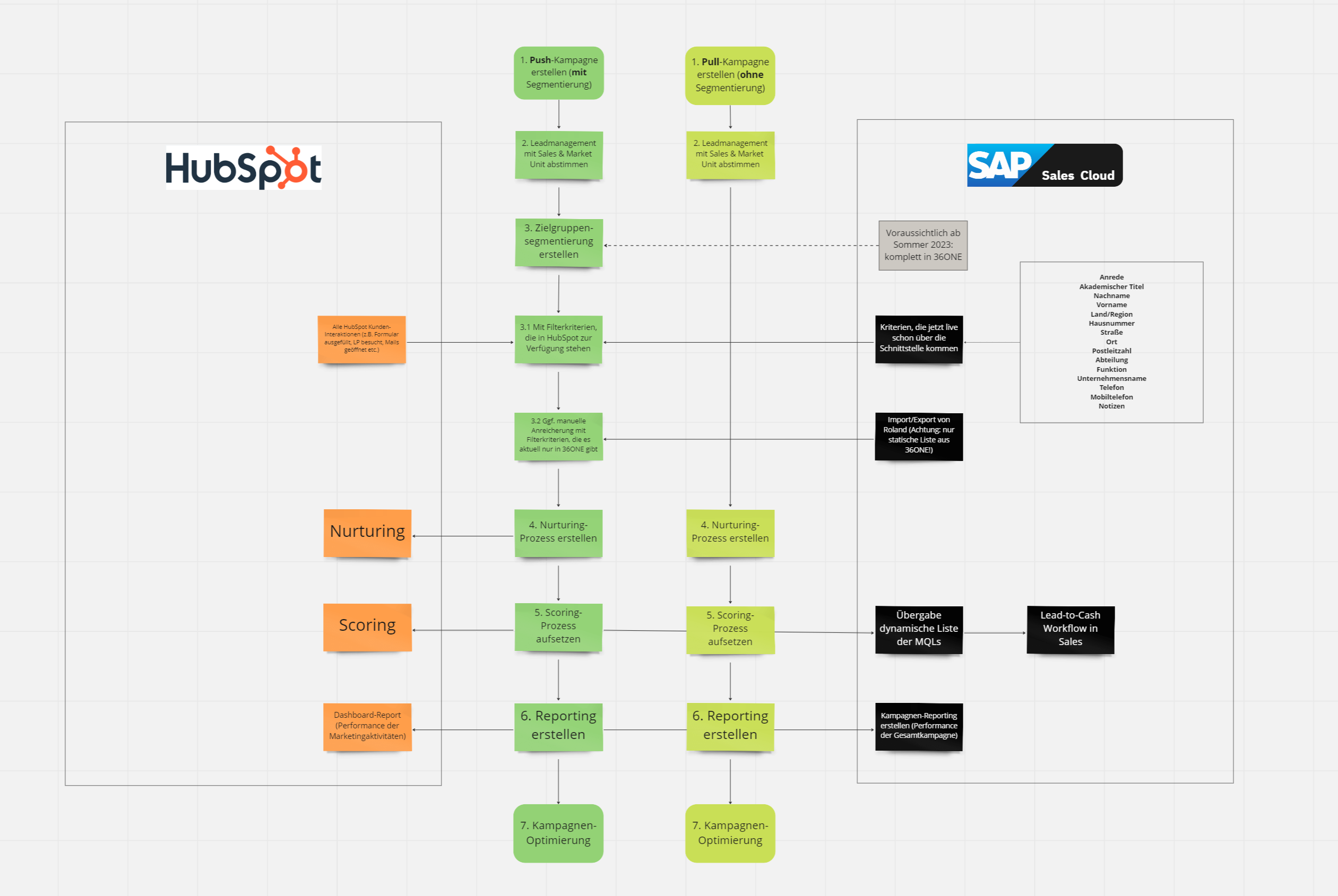 Mit dem ersten Schnittstellen-Rollout werden die wichtigsten Kunden-/Kontaktdaten (siehe Grafik!), der DOI-Status und Newsletter-Anmeldungen zwischen beiden Systemen synchronisiert. Zusätzlich können relevante Leads (MQLs) automatisiert von HubSpot ins 36ONE übertragen werden, die sich vorher durch individuelle Maßnahmen einer Marketingkampagne (Nurturing und Scoring) dafür qualifiziert haben. Optimalerweise können sich die Vertriebsmitarbeiter auf dieser Basis auf die wirklich spannenden Leads konzentrieren.