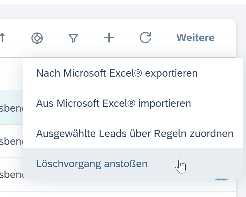 Dazu den Lead in 36One anwählen und über den Button „Weitere“ den Löschvorgang anstoßen.