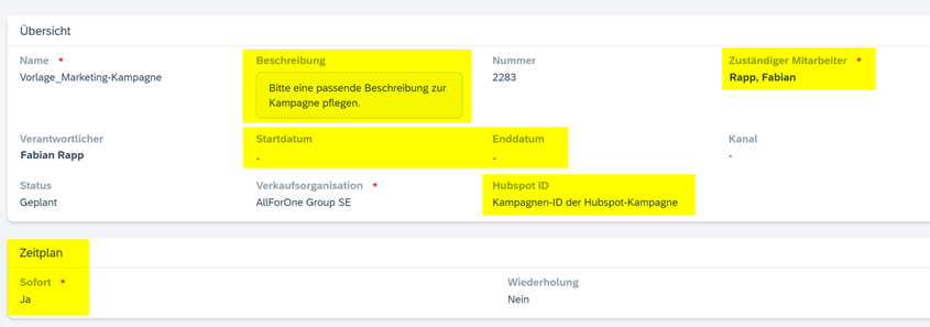 Beschreibung der Kampagne bzw. Infos für den Sales (ggfs. Inhalt im KickOff mit Sales Development & Fachbereich abstimmen; bspw. URL einer Landingpage). - Zuständiger Mitarbeiter