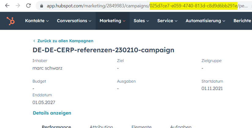 Die Kampagnen-ID findest du, indem du die Kampagne in Hubspot aufrufst und anschließend die zweite Zahlen-&Buchstabenfolge in der URL (4. Verzeichnis) kopierst.